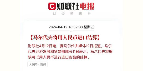 据央视新闻援引马尔代夫媒体4月12日报道,马尔代夫经济发展和贸易部部长11日表示,马尔代夫将很快可以用人民币进行进口货品的结算。